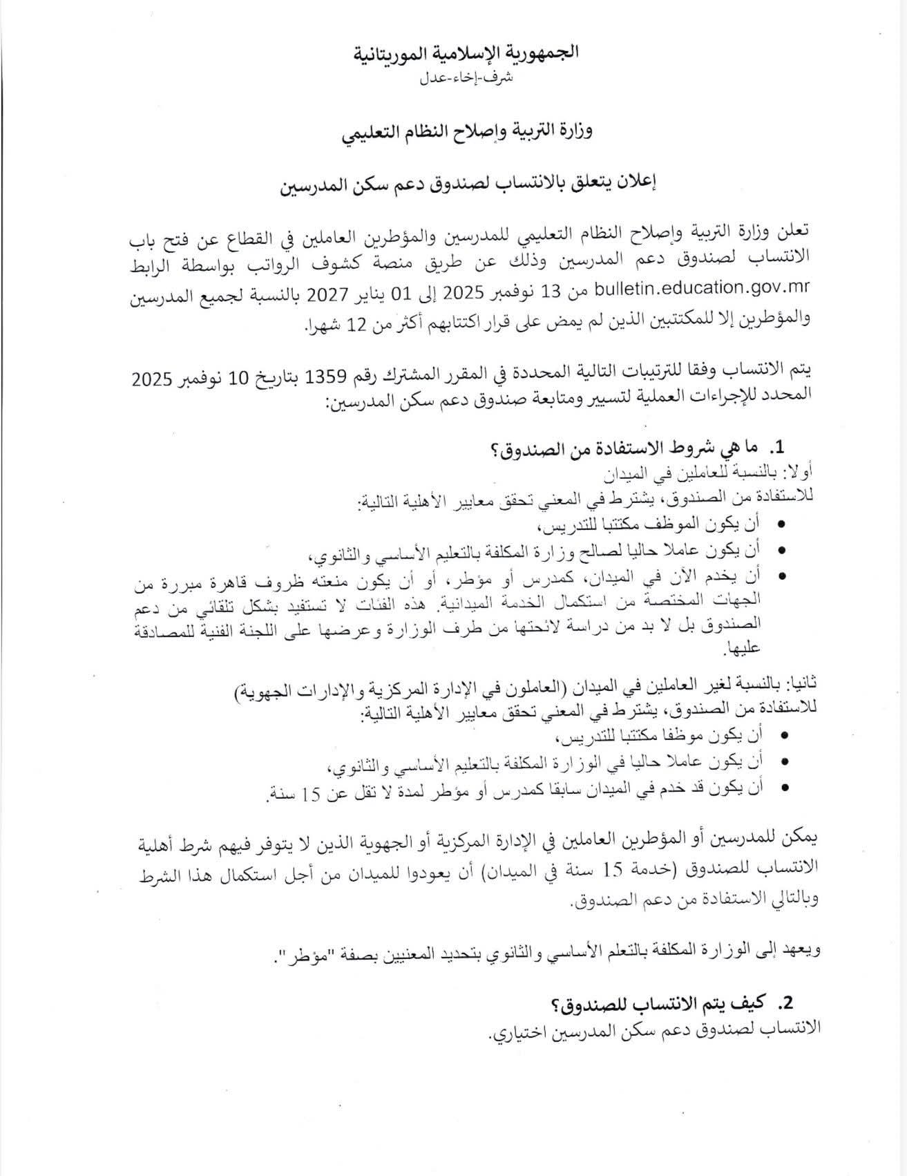 وقالت الوزارة إن باب الانتساب يفتح من 13 نوفمبر 2025 إلى 01 يناير 2027 بالنسبة لجميع اللميد naeen والمؤطرين إلا للمكتتبين الذين لم يمض على قرار اكتتابهم أكثر من 12 شهرا.
