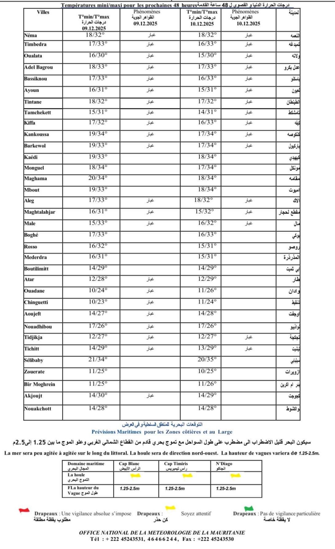 وأوضحت أن الرؤية ستتأثر بفعل الأتربة على الحوضين ولعصابة ولبراكنة وتكانت وإينشيري وآدراروداخلت نواذيبو.