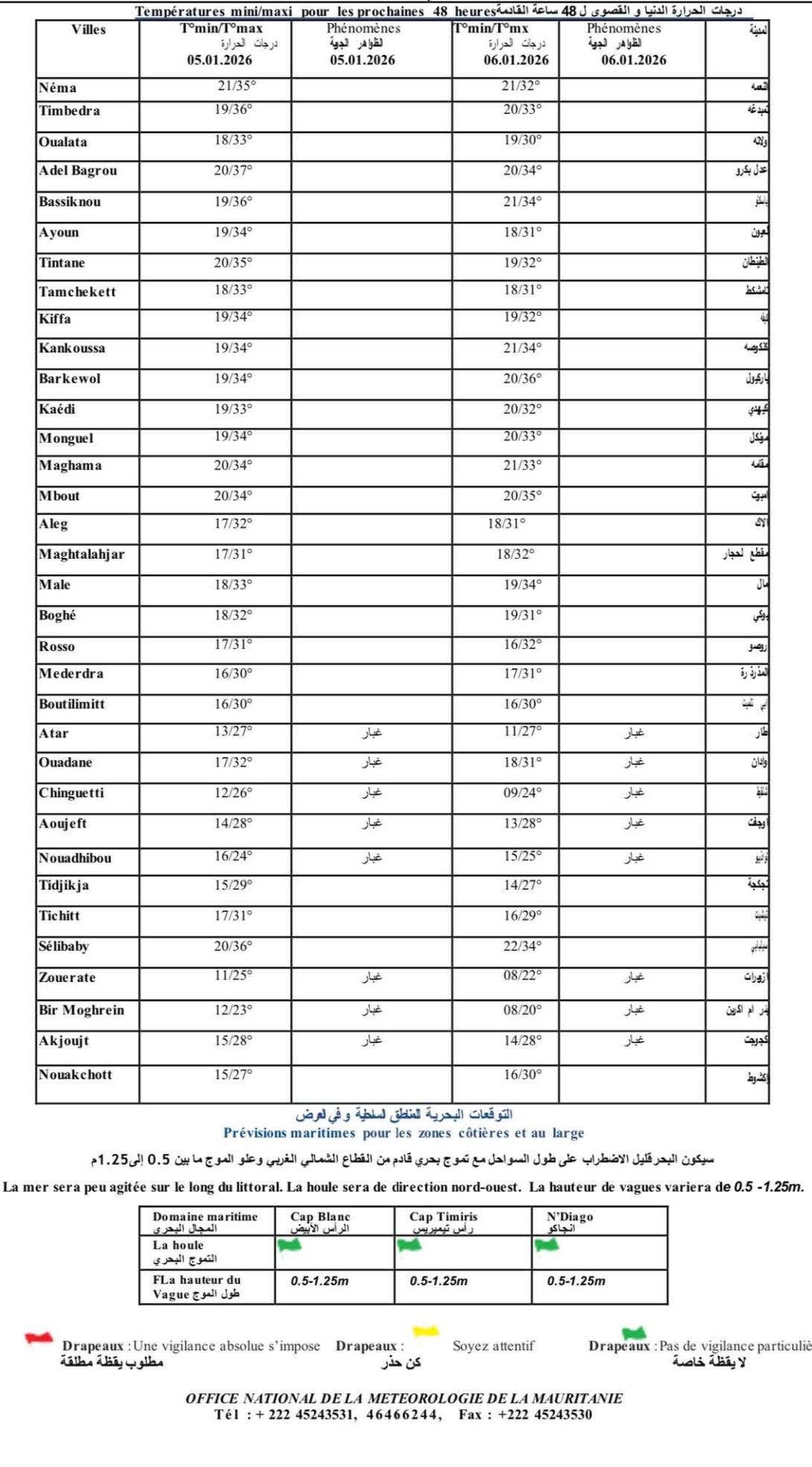 وقالت الهيئة في نشرة لها إن درجات الحرارة ساشهد انخفاضًا طفيفًا على شمال وغرب ووسط البلاد، مع رؤية متأثرة بفعل الأتربة على تيرس الزمور وداخلت نواذيبو وآدرار وإنشيري.