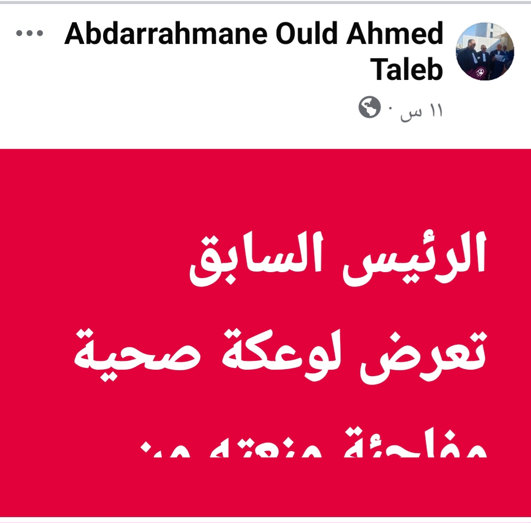 قال محامي الرئيس السابق عبد الرحمن ولد أحمد طالب أن الرئيس السابق تعرض لوعكة صحية مفاجئة منعته من أداء صلاة المغرب، ما استدعى استدعاء الطبيب على الفور. وأشار في تدوينة له على الفيسبوك أن وضعيته الصحية وُصفت بالمقلقة، ولم تعد تحتمل التأجيل، في انتظار ما ستسفر عنه الفحوصات الطبية خلال الساعات المقبلة