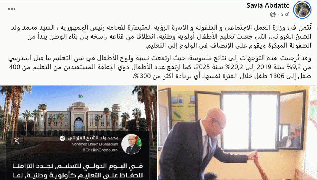 أعلنت وزيرة العمل الاجتماعي والطفولة والأسرة، صفية بنت انتهاه، تسجيل قفزة كبيرة في عدد الأطفال ذوي الإعاقة المدمجين في المنظومة التعليمية، حيث ارتفع العدد من 400 طفل سنة 2019 إلى 1,306 أطفال في أفق 2025، وهو ما يمثل زيادة تتجاوز ثلاثة أضعاف.