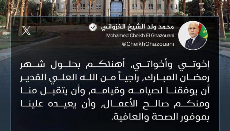 هنأ رئيس الجمهورية محمد ولد الشيخ الغزواني، الشعب الموريتاني بمناسبة حلول شهر رمضان المبارك، متمنياً للجميع الصحة والعافية وداعيا الله تقبل الأعمال الصالحة.