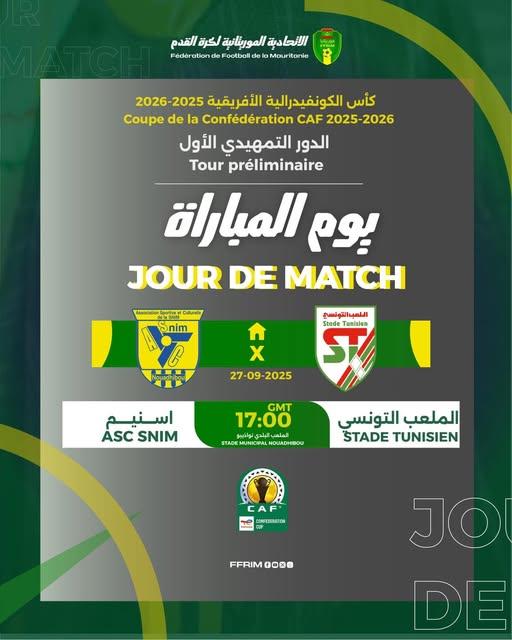 Sep 27 / التعليقات اسنيم يواجه الملعب التونسي بواسطة محمد محمود يستضيف نادي اسنيم، نظيره نادي الملعب التونسي مساء اليوم السبت في الملعب البلدي بنواذبيو.وتأتي المباراة، لحساب إياب الدور التمهيدي الأول من كأس الكونفيدرالية الأفريقية لكرة القدم.وخسر اسنيم ذهابا، بهدفين دون مقابل. سبت, 2025/09/27 - 13:36
