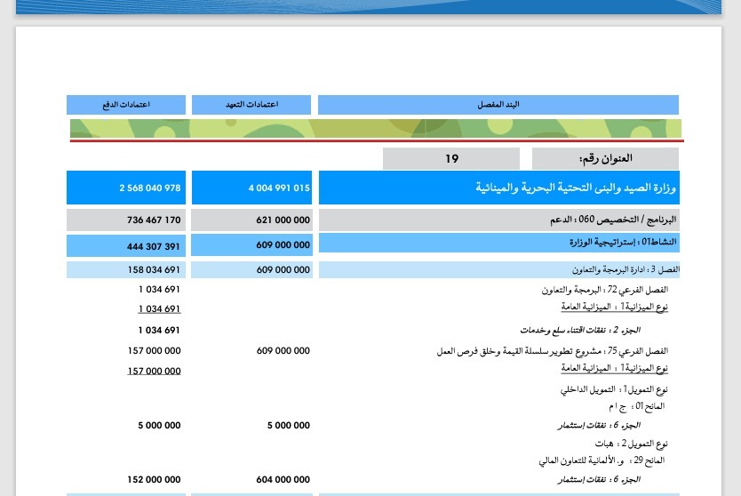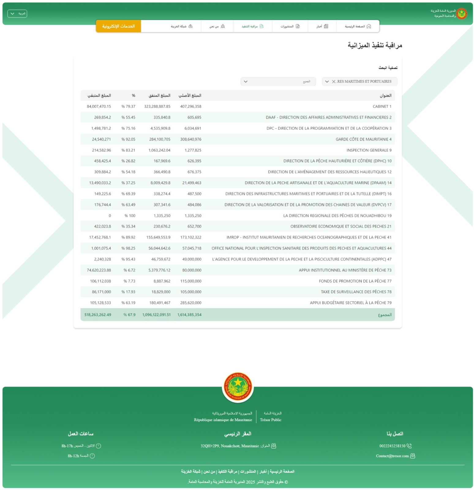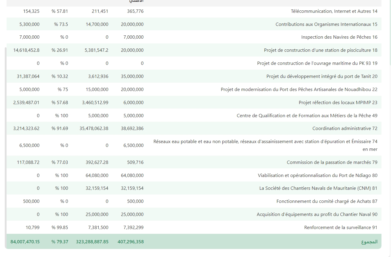في المقابل وبالنظر إلى الأرقام الحكومية والإحصائيات المعلنة على منصة الخزينة العامة للدولة ورسم صرفها فإن ميزانية وزارة الصيد والبنى التحتية المينائية بلغت في عام 2025، 16 مليار أوقية قديمة، بالنسبة لديوان الوزير فقد رصد له مبلغ 4 مليارات أوقية قديمة تم صرف، 3 مليارات و20 مليون أوقية قديمة منها، فيما تظهر مؤشرات الميزانية بقاء مبلغ 840 مليون أوقية.