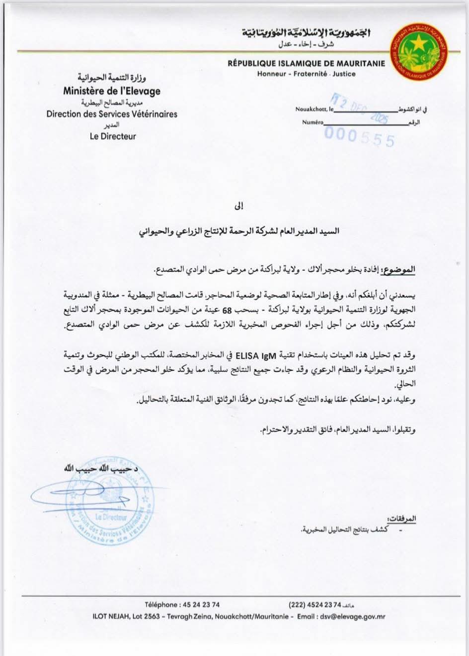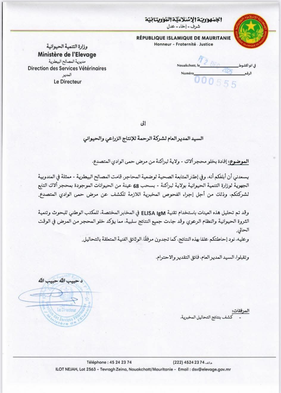 أعلنت إدارة المصالح البيطرية بوزارة التنمية الحيوانية اليوم التثنين خلو محجر ألاك، التابع لشركة الرحمة للإنتاج الزراعي والحيواني بولاية لبراكنة، من مرض حمى الوادي المتصدع.