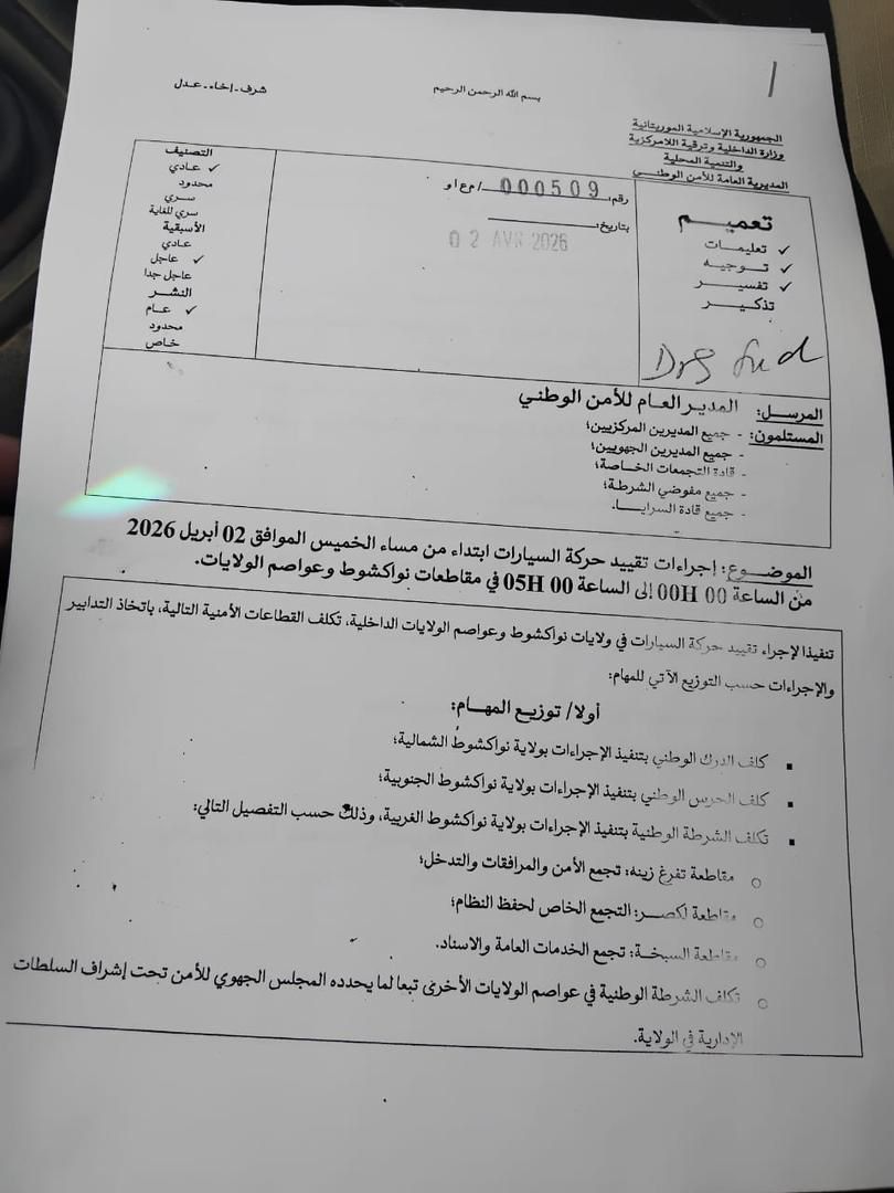 أقرت الإدارة العامة للأمن الوطني إجراءات جديدة لتنظيم حركة السيارات خلال ساعات الليل، تقضي بمنع التنقل من منتصف الليل حتى الخامسة صباحاً، ابتداءً من 2 أبريل 2026، وذلك في نواكشوط وكافة عواصم الولايات.