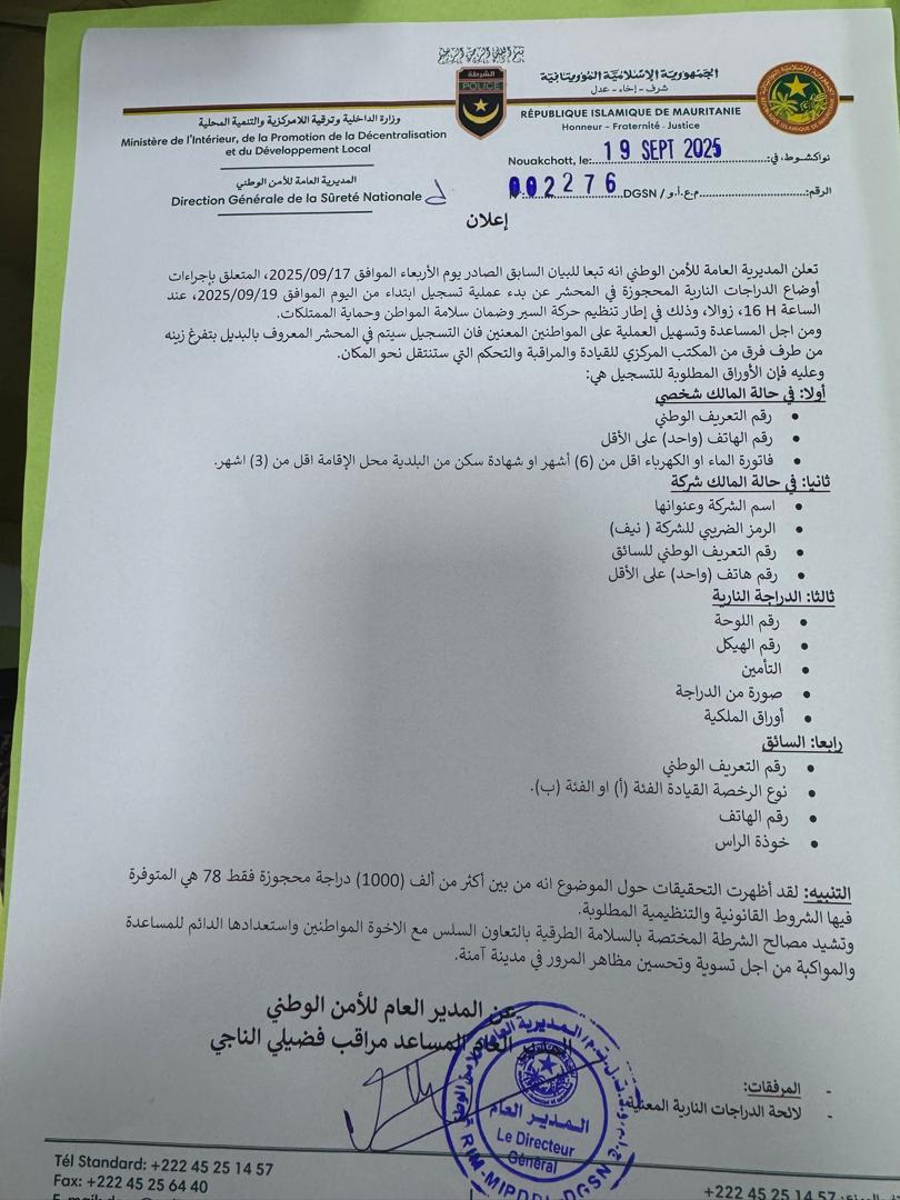 أعلنت الإدارة العامة للامن الوطني الجمعة بدء عملية تسجيل الدراجات النارية المحجوزة في نواكشوط وذلك ضمن تنظيم حركة السير وضمان سلامة المواطن وحماية الممتلكات وفق البيان