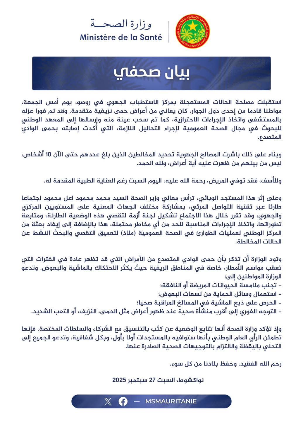 "استقبلت مصلحة الحالات المستعجلة بمركز الاستطباب الجهوي في روصو، يوم أمس الجمعة، مواطنا قادما من إحدى دول الجوار، كان يعاني من أعراض حمى نزيفية متقدمة. وقد تم فورا عزله بالمستشفى واتخاذ الإجراءات الاحترازية، كما تم سحب عينة منه وإرسالها إلى المعهد الوطني للبحوث في مجال الصحة العمومية لإجراء التحاليل اللازمة، التي أكدت إصابته بحمى الوادي المتصدع.