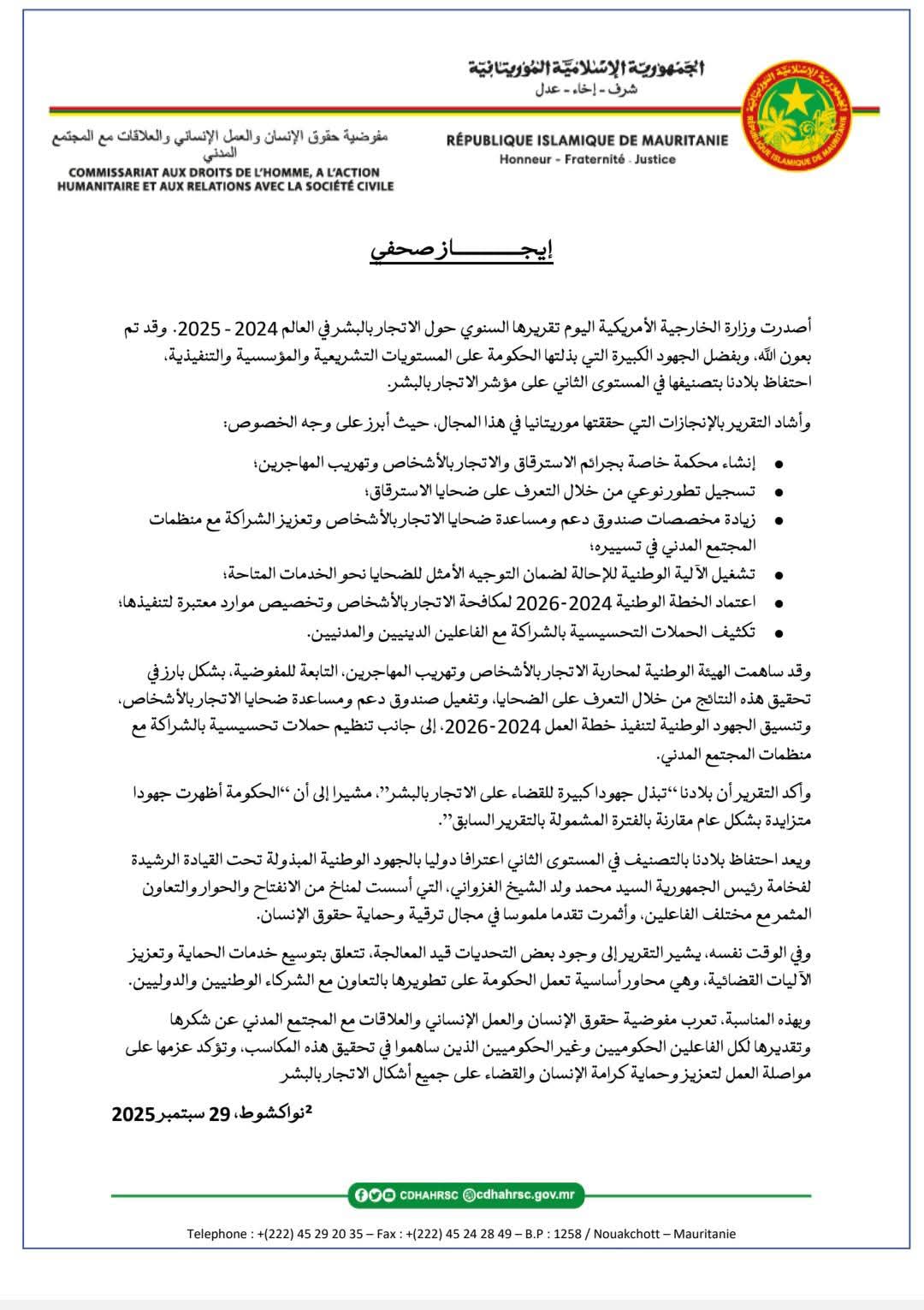 ويعد احتفاظ بلادنا بالتصنيف في المستوى الثاني اعترافا دوليا بالجهود الوطنية المبذولة تحت القيادة الرشيدة لفخامة رئيس الجمهورية السيد محمد ولد الشيخ الغزواني، التي أسست لمناخ من الانفتاح والحوار والتعاون المثمر مع مختلف الفاعلين، وأثمرت تقدما ملموسا في مجال ترقية وحماية حقوق الإنسان.