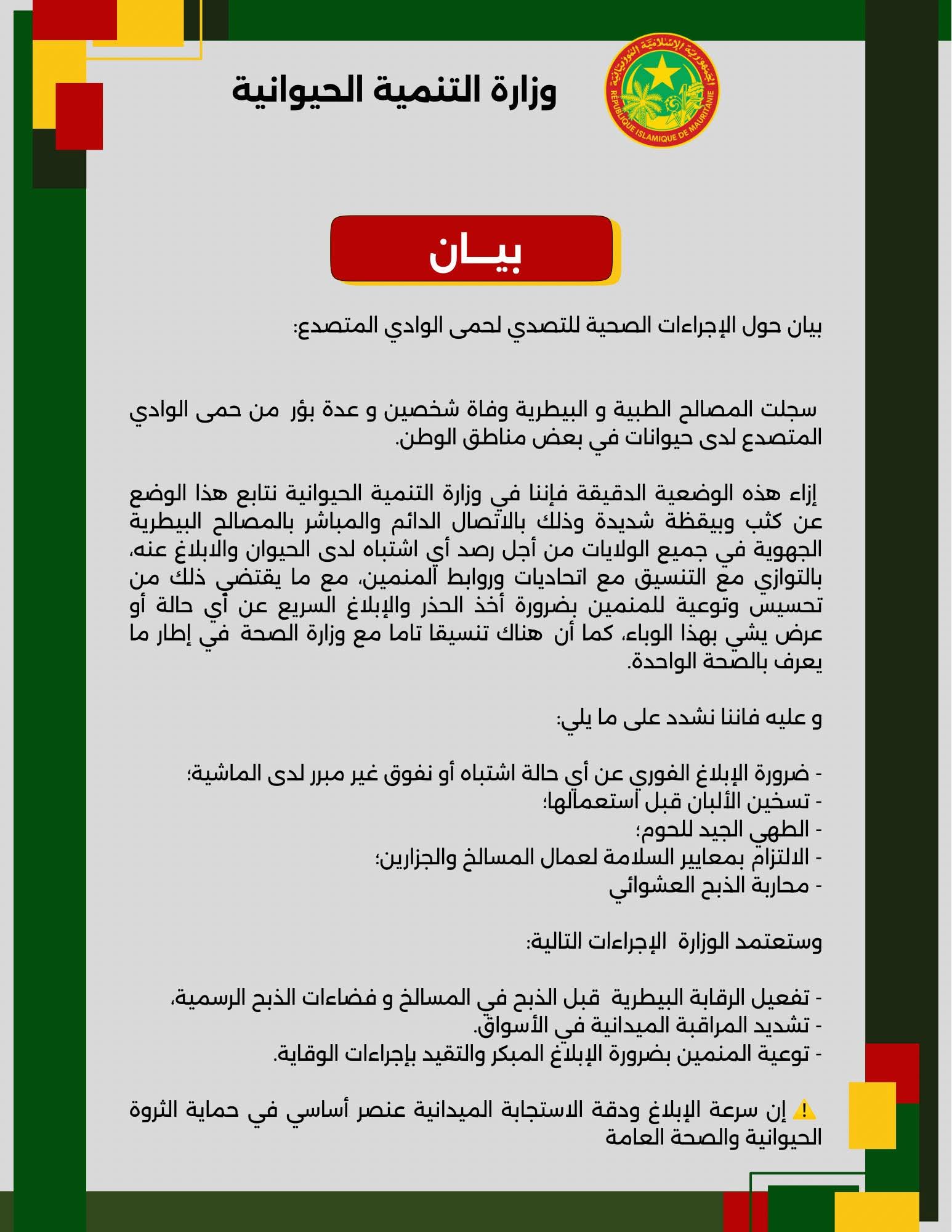 وأوضحت الوزارة في بيانها أن المصالح الطبية والبيطرية سجلت وفاة شخصين و عدة بؤر  من حمى الوادي المتصدع لدى حيوانات في بعض مناطق الوطن.