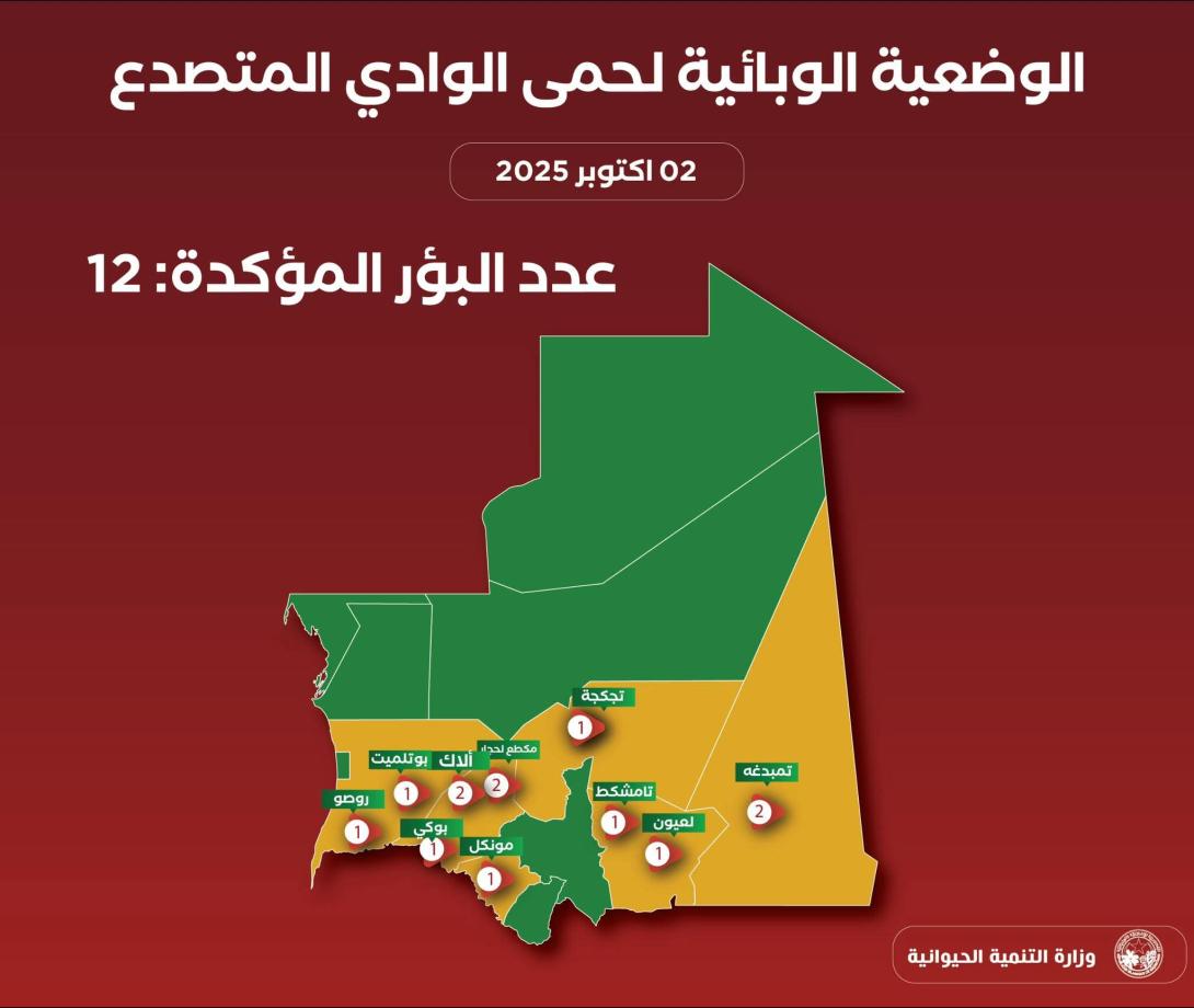 أعلنت وزارة التنمية الحيوانية ارتفاع البؤر الحاضنة لحمى الوادي المتصدع إلى 12 بؤرة موزعة على 10 مقاطعات في 6 ولايات داخلية.