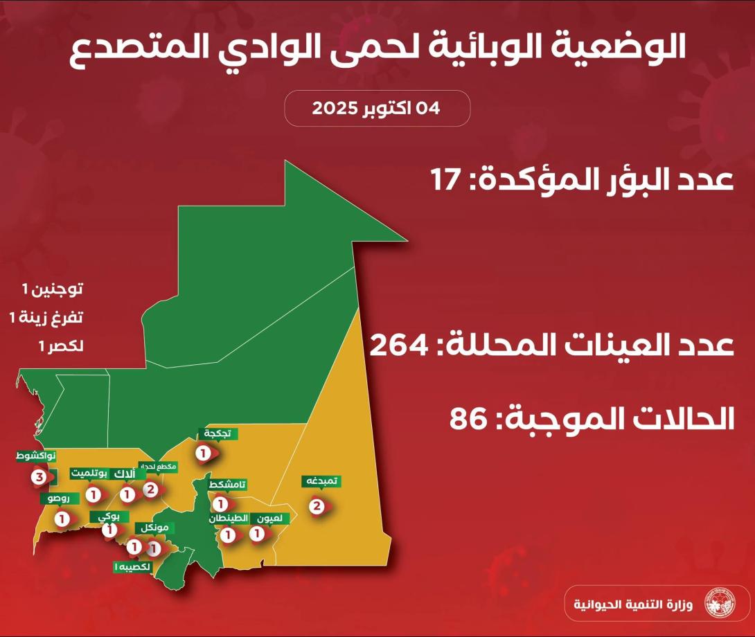 قالت وزارة التنمية الحيوانية إن مصالحها المصالح البيطرية سجلت 17 بؤرة حاضنة لحمى الوادي المتصدع موزعة على 15 مقاطعة تتبع ل8 ولايات