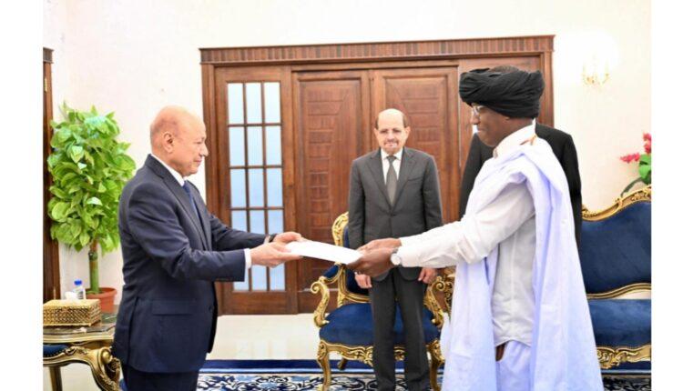 وتسلم أوراق اعتماده، الدكتور رشاد محمد العليمي، رئيس مجلس القيادة الرئاسي اليمني.